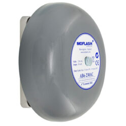 Motordrevet alarmklokke med IP44. Alarmklokken er produsert med 6” grå aluminiumslyd og bunnplate av plast.